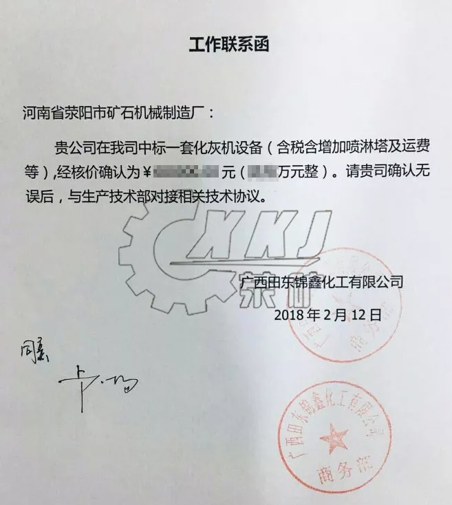 2018年初,河南省滎陽市礦山機械制造廠在廣西田東錦鑫化工有限公司2.5X22m回轉式化灰機招投標項目中,依靠設備技術、銷售業(yè)績等過硬的綜合實力,在招標過程中脫穎而出,成功奪標。